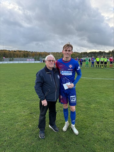 Foto:100 kamps jubilar Jalle får gavekort af formanden for Gug Boldklubs Venner Jørn Axelsen.